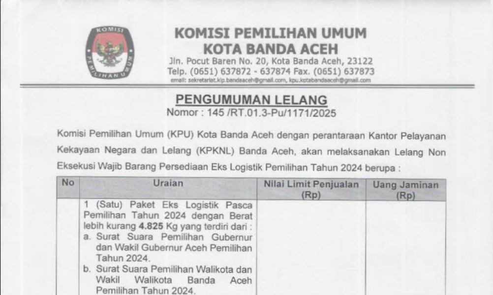 KIP Banda Aceh News - KIP Kota Banda Aceh dengan perantaraan Kantor Pelayanan Kekayaan Negara dan Lelang (KPKNL) Banda Aceh, akan melaksanakan Lelang Non Eksekusi Wajib Barang Persediaan Eks Logistik Pemilihan Tahun 2024.