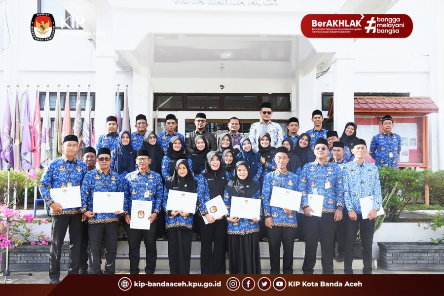 KIP Banda Aceh News - Sejumlah Pegawai Non ASN di Sekretariat Komisi Independen Pemilihan (KIP) Kota Banda Aceh menerima Surat Keputusan Pengangkatan PPPK Tahap I Tahun 2024 dan Surat Keputusan Kenaikan Pangkat untuk beberapa Pegawai lainnya di Halaman Kantor KIP Kota Banda Aceh usai upacara Peringatan Hari Kesaktian Pancasila, pada Rabu 1 Oktober 2025.