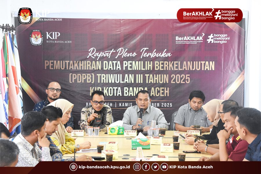 KIP Banda Aceh News - Komisi Independen Pemilihan (KIP) Kota Banda Aceh melaksanakan Rapat Pleno Terbuka Pemutakhiran Data Pemilih Berkelanjutan (PDPB) Triwulan III Tahun 2025 di Aula KIP Kota Banda Aceh, Kamis 2 Oktober 2025.