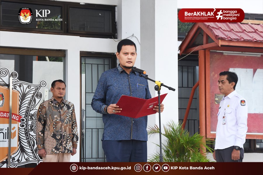 KIP Banda Aceh News - Ketua Divisi Teknis Penyelenggaraan Komisi Independen Pemilihan (KIP) Kota Banda Aceh Rachmat Hidayat menjadi Pembina Apel, Senin 24 November 2025, di halaman Kantor KIP Kota Banda Aceh.