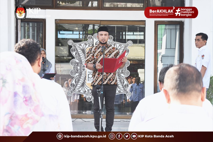 KIP Banda Aceh News - Ketua Divisi Sosialisasi, Pendidikan Pemilih, Parmas dan SDM KIP Kota Banda Aceh, Muhammad Zar menjadi Pembina Apel pada Senin, 8 Desember 2025 di halaman Kantor KIP Kota Banda Aceh.