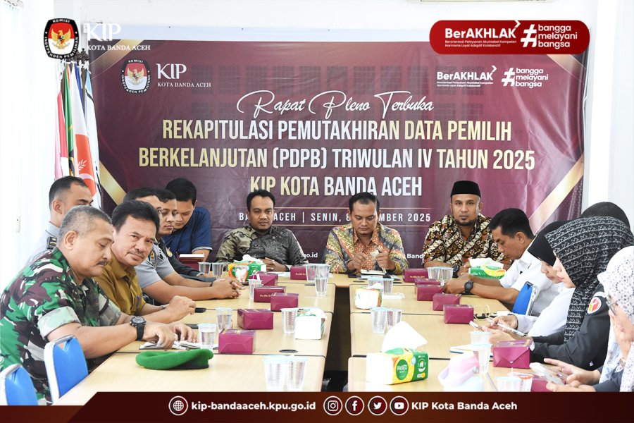 KIP Banda Aceh News - Komisi Independen Pemilihan (KIP) Kota Banda Aceh melaksanakan Rapat Pleno Terbuka Pemutakhiran Data Pemilih Berkelanjutan (PDPB) Triwulan IV Tahun 2025 di Aula Kantor KIP Kota Banda Aceh, Senin 8 Desember 2025.