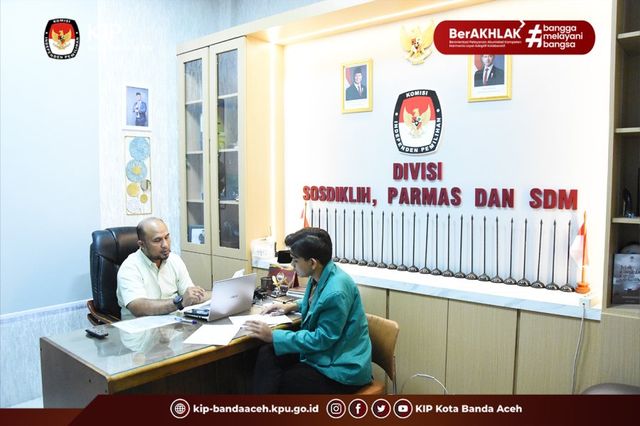 KIP Banda Aceh News - Ketua Divisi Sosialisasi, Pendidikan Pemilih, Partisipasi Masyarakat dan SDM KIP Kota Banda Aceh, Muhammad Zar menerima kunjungan mahasiswa penelitian dari Universitas Syiah Kuala, Jumat 6 Februari 2026, di ruang kerjanya.