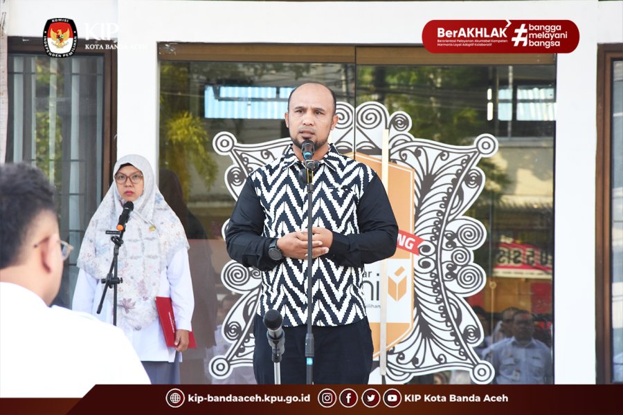 KIP Banda Aceh News - Ketua Divisi Sosialisasi, Pendidikan Pemilih, Partisipasi Masyarakat dan SDM KIP Kota Banda Aceh, Muhammad Zar menjadi Pembina Apel pada Senin, 9 Februari 2026, di halaman Kantor KIP Kota Banda Aceh.