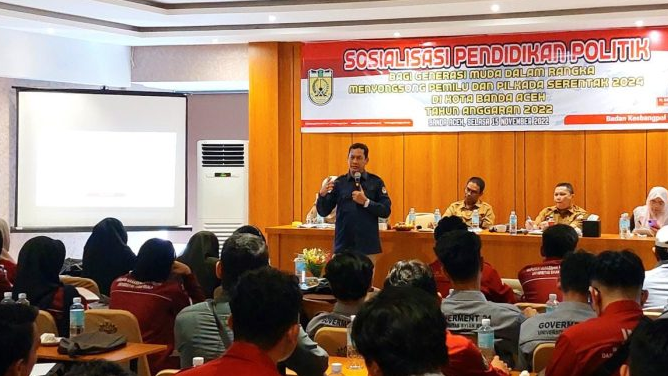 KIP Banda Aceh News – Ketua Divisi Perencanaan, Data dan Informasi (RENDATIN) Komisi Independen Pemilihan (KIP) Banda Aceh, Yushadi menjadi narasumber dalam kegiatan Sosialisasi Pendidikan Politik Bagi Generasi Muda Dalam Menyongsong Pemilu dan Pemilihan Serentak 2024 yang diselenggarakan oleh Kesbangpol Kota Banda Aceh di Hotel Grand Arabia, Selasa (15/11/2022).