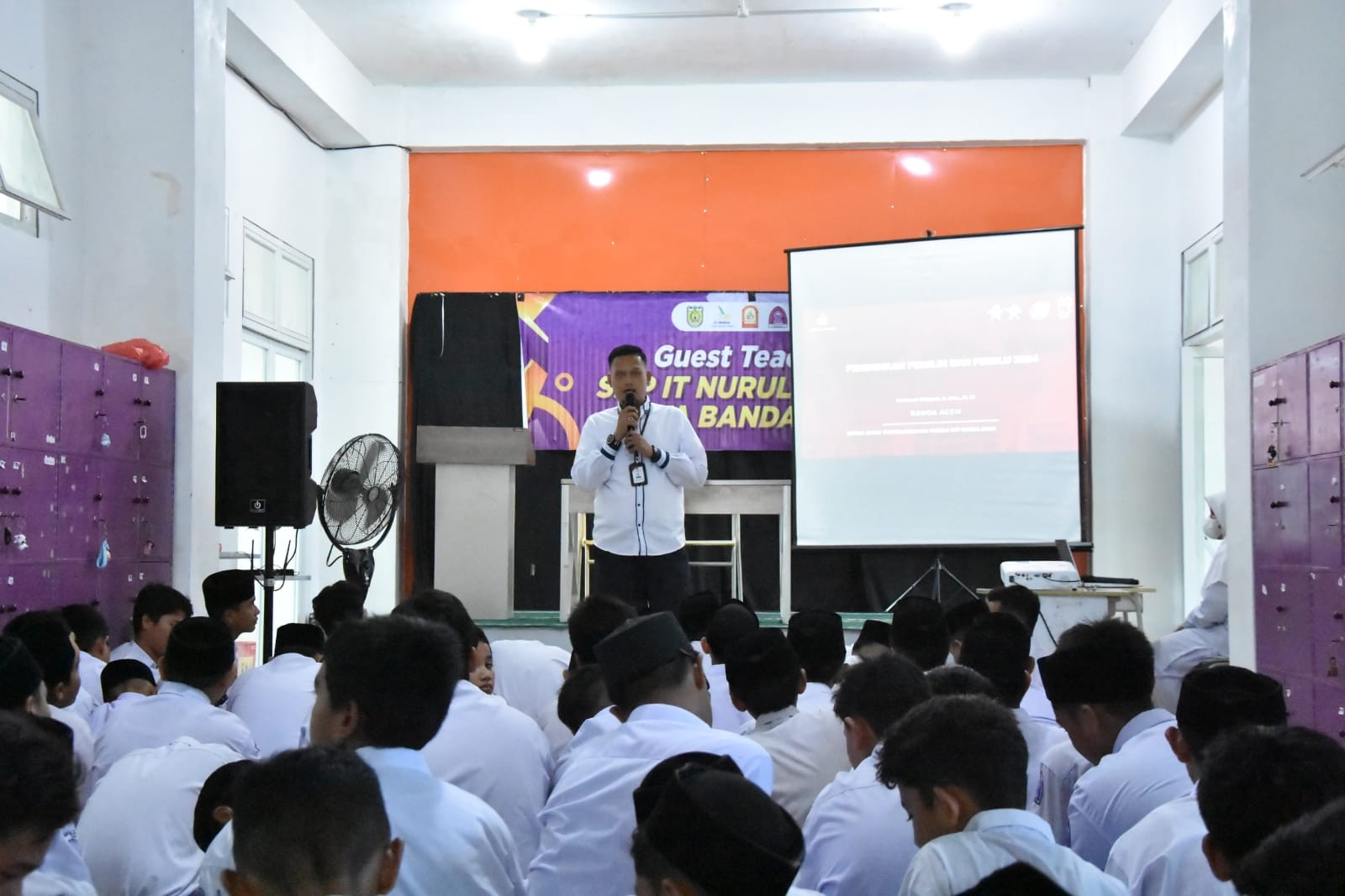 KIP Banda Aceh News – Ketua Divisi (Kadiv) Teknis Penyelenggara KIP Kota Banda Aceh, Rachmat Hidayat menjadi Narasumber kegiatan Sosialisasi Pendidikan Pemilih Pemilu 2024 di Sekolah Menengah Pertama Islam Terpadu (SMP IT), Senin (9/10/2023).