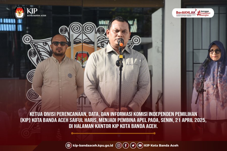 KIP Banda Aceh News – Divisi Perencanaan, Data, dan Informasi Komisi Independen Pemilihan (KIP) Kota Banda Aceh Saiful Haris, menjadi pembina apel pada, Senin, 21 April 2025, di halaman kantor KIP Kota Banda Aceh.