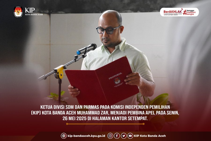 KIP Banda Aceh News – Ketua Divisi SDM dan Parmas pada Komisi Independen Pemilihan (KIP) Kota Banda Aceh Muhammad Zar, menjadi pembina apel pada Senin, 26 Mei 2025 di halaman kantor setempat.