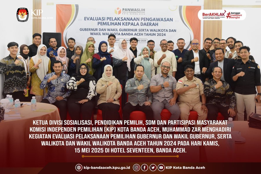KIP Banda Aceh News – Ketua Divisi Sosialisasi, Pendidikan Pemilih, SDM dan Partisipasi Masyarakat Komisi Independen Pemilihan (KIP) Kota Banda Ace, Muhammad Zar menghadiri Kegiatan Evaluasi Pelaksanaan Pemilihan Gubernur dan Wakil Gubernur, serta Walikota dan Wakil Walikota Banda Aceh Tahun 2024 pada hari Senin, 15 Mei 2025 di Hotel Seventeen, Banda Aceh.