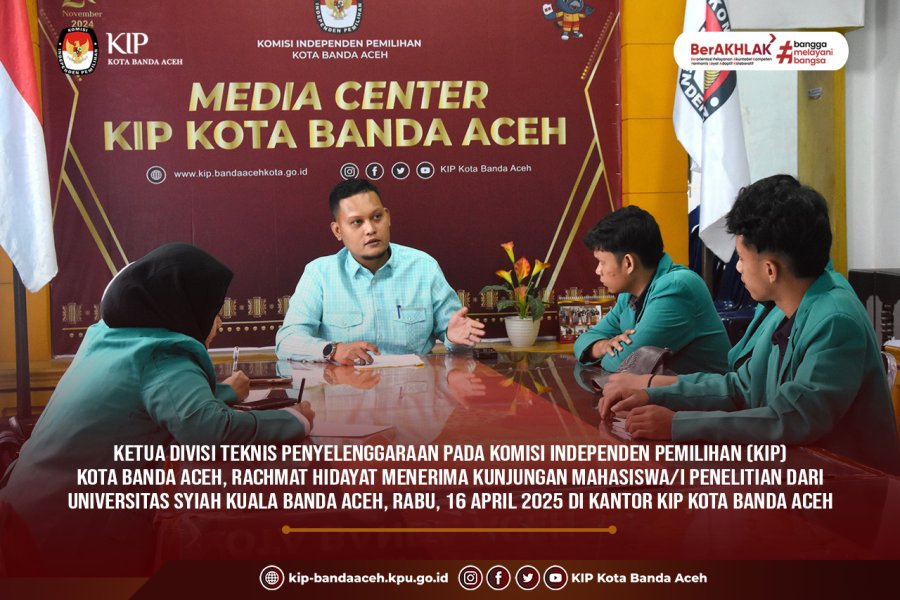 KIP Banda Aceh News – Ketua Divisi Teknis Penyelenggaraan pada Komisi Independen Pemilihan (KIP) Kota Banda Aceh, Rachmat Hidayat menerima kunjungan mahasiswa/i penelitian dari Universitas Syiah Kuala Banda Aceh, Rabu, 16 April 2025 di Kantor KIP Kota Banda Aceh.