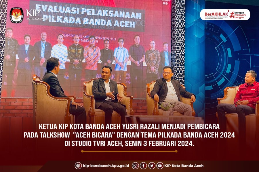 KIP Banda Aceh News – Ketua Komisi Independen Pemilihan (KIP) Kota Banda Aceh Yusri Razali menjadi pembicara pada talkshow "Aceh Bicara" dengan tema Pilkada Banda Aceh 2024 di Studio TVRI Aceh, Senin 3 Februari 2024.