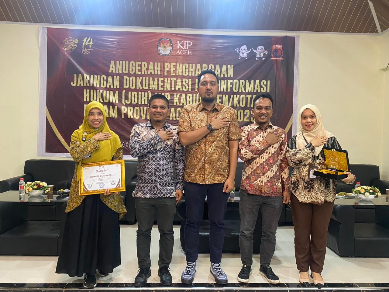 KIP Banda Aceh News – Komisi Independen Pemilihan (KIP) Kota Banda Aceh meraih Penghargaan Terbaik Kedua Pengelolaan Jaringan Dokumentasi dan Informasi Hukum (JDIH) Kategori Satuan Kerja (Satker) Kecil Se-Aceh pada Kegiatan Anugerah Penghargaan Jaringan Dokumentasi dan Informasi Hukum (JDIH) KIP Kabupaten/Kota dalam Provinsi Aceh, di Arpen Bungalow, Iboih Kota Sabang, Jum,at (15/12/2023).