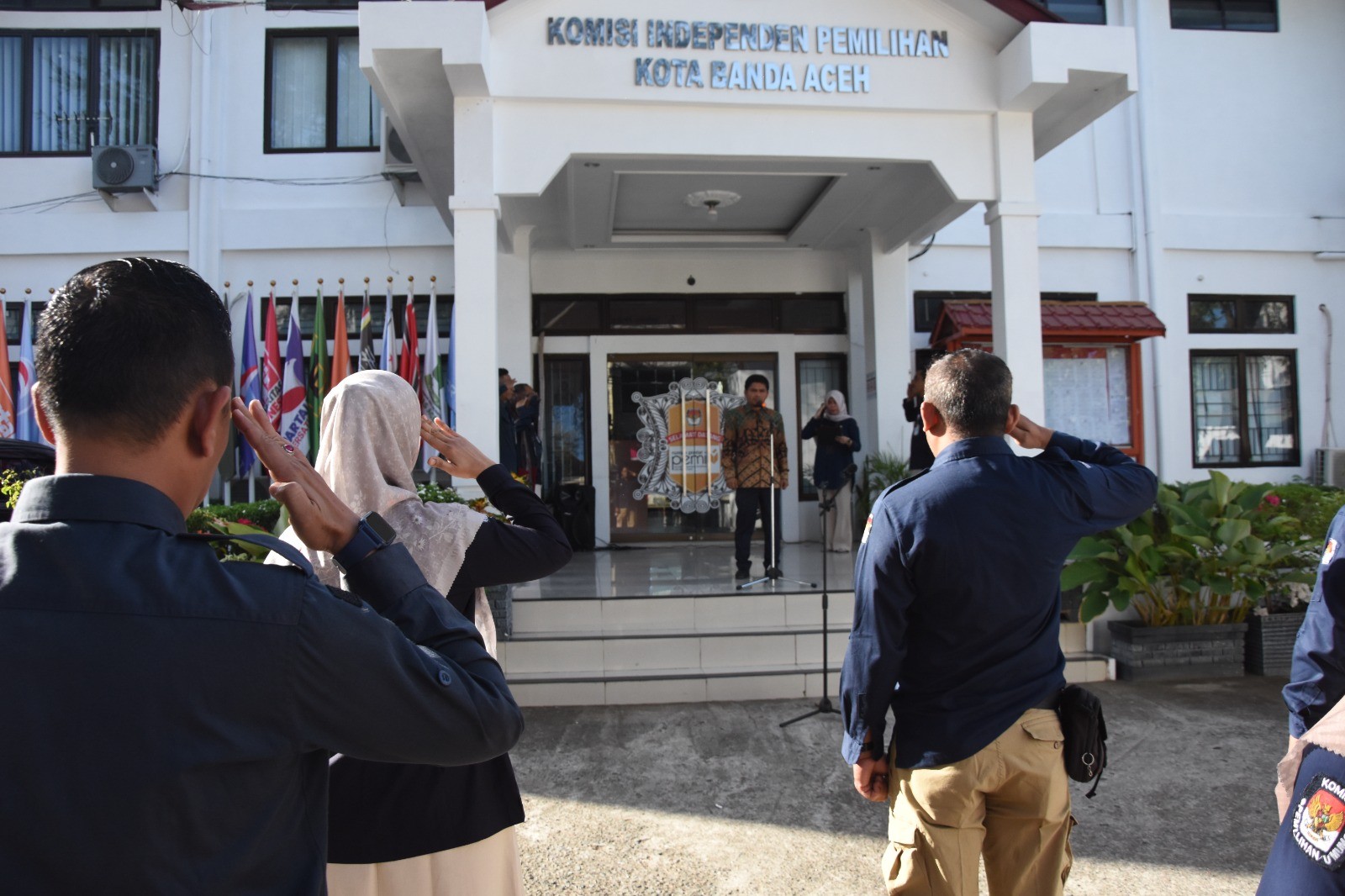 Ketua Divisi Hukum dan Pengawasan KIP Kota Banda Aceh, Hasbullah bertindak sebagai Pembina Upacara yang berlangsung secara khidmad dan tertib.