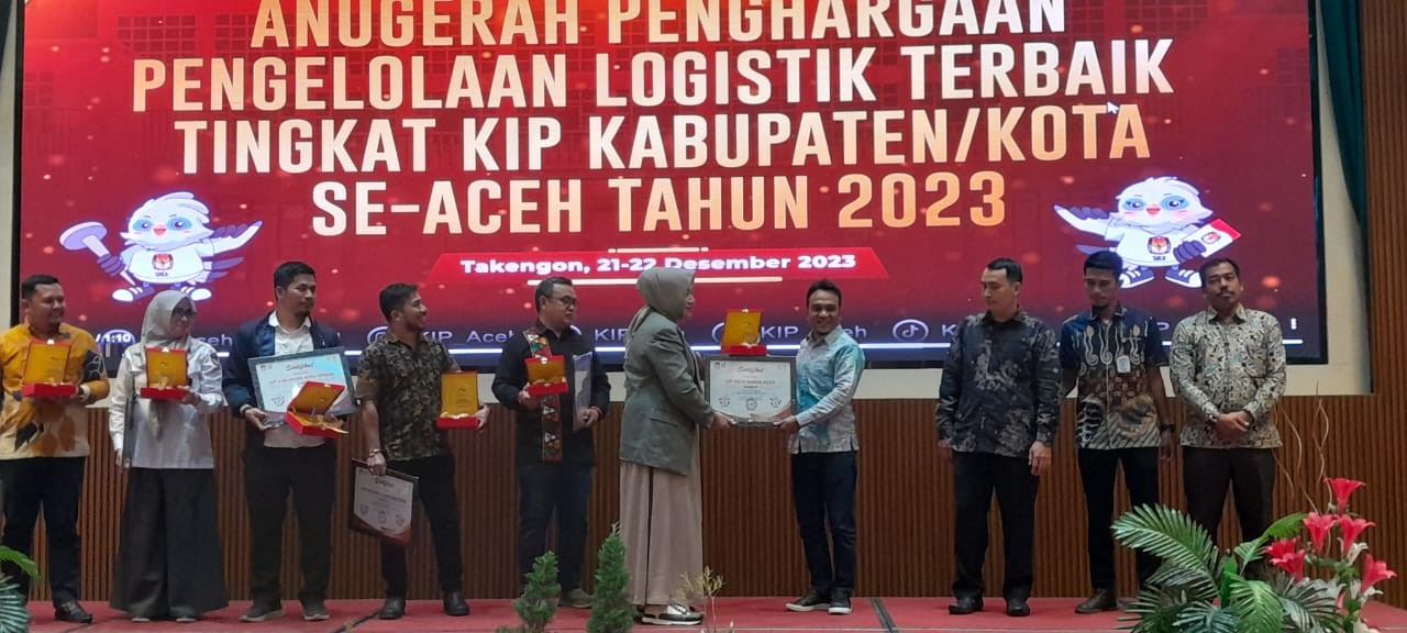 KIP Banda Aceh News – Komisi Independen Pemilihan (KIP) Kota Banda Aceh meraih Penghargaan Pengelolaan Logistik Pemilu 2024 Kategori Tim Logistik Terinspiratif Ke – III di Hotel Parkside Gayo Metro Takengon – Aceh Tengah, Kamis, (21/12/2023).
