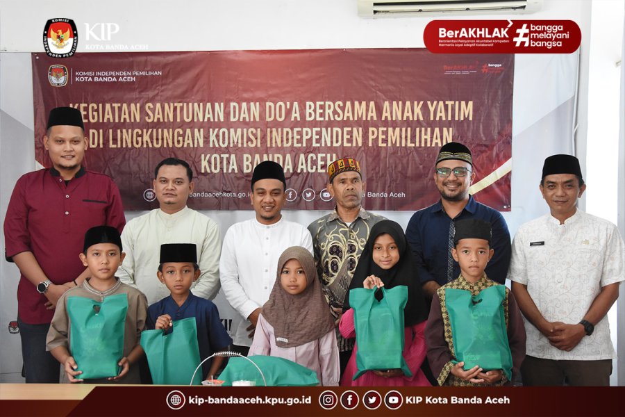 Bingkisan santunan anak yatim dibagikan langsung oleh Ketua KIP Kota Banda Aceh Yusri Razali, anggota Rachmat Hidayat, Muhammad Zar, dan Saiful Haris serta Sekretaris Erminzal.