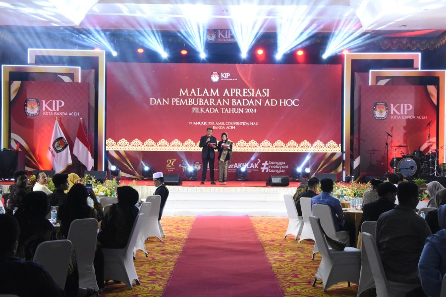 KIP Banda Aceh News – Komisi Independen Pemilihan (KIP) Kota Banda Aceh melaksanakan Malam Apresiasi dan Pembubaran Badan Adhoc Pilkada Tahun 2024 di Gedung Amel Convention Hall Banda Aceh, Sabtu, 25 Januari 2025.
