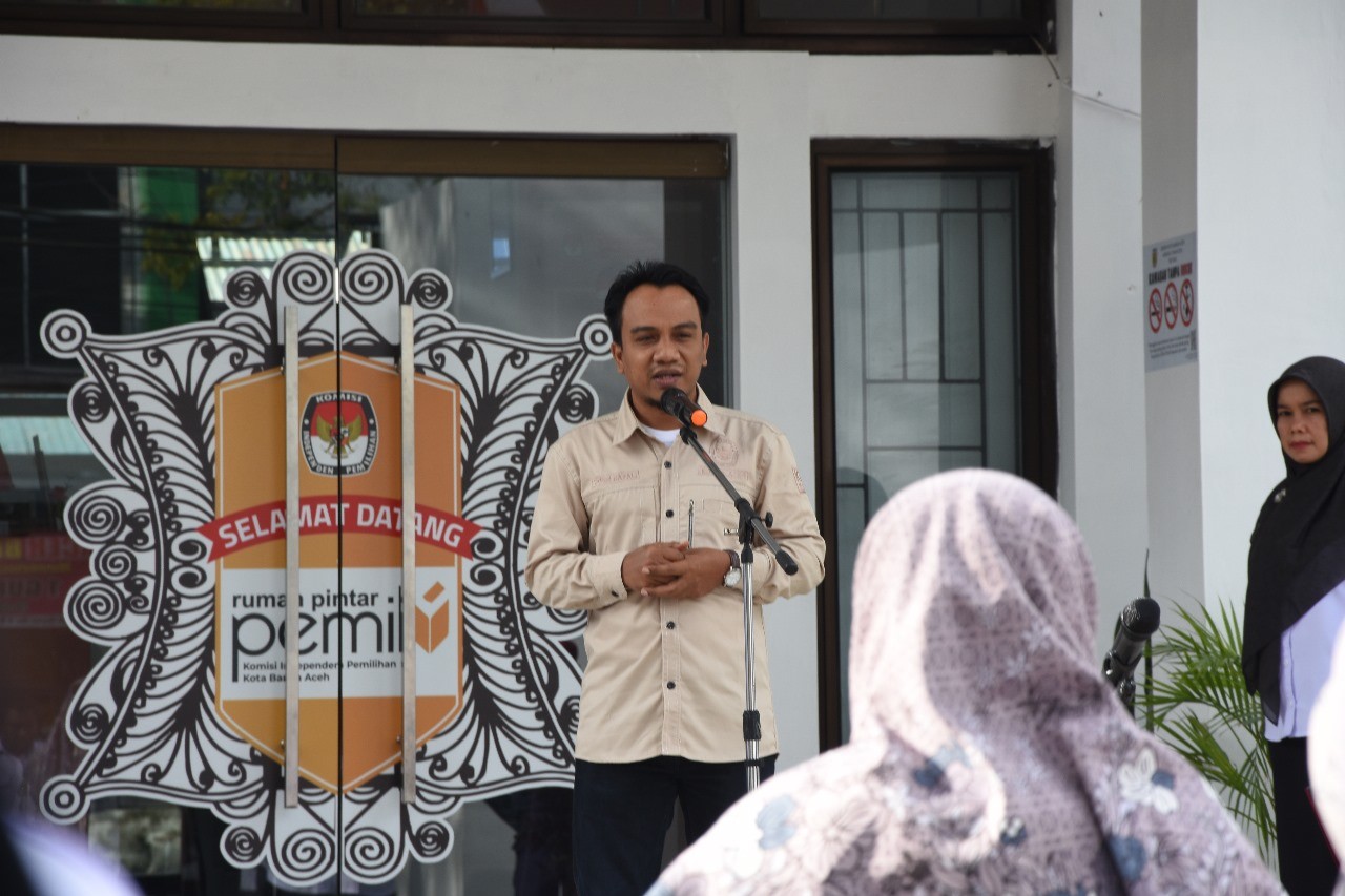 KIP Banda Aceh News – Komisi Independen Pemilihan (KIP) Kota Banda Aceh melaksanakan apel pagi dengan pembina apel Ketua KIP Kota Banda Aceh, Yusri Razali di halaman kantor KIP Kota Banda Aceh, Senin, (23/10/2023).