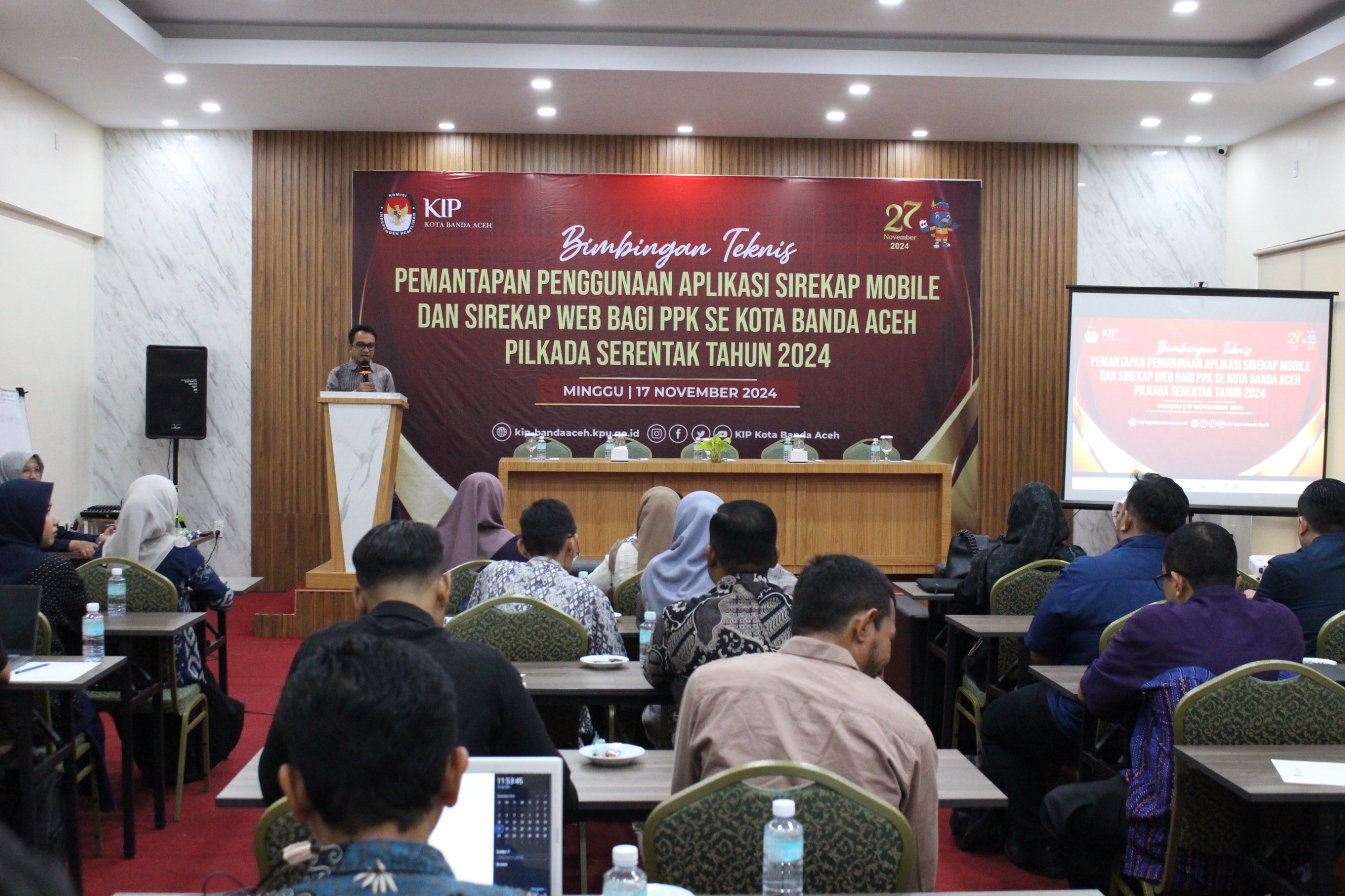 KIP Banda Aceh News – Komisi Independen Pemilihan (KIP) Kota Banda Aceh melakukan Pemantapan Bimbingan Teknis Pemantapan Penggunaan Aplikasi Sirekap Mobile dan Sirekap Web kepada Panitia Pemilihan Kecamatan Pilkada 2024 Kota Banda Aceh di Hotel Grand Langkawi Banda Aceh, Minggu, 17 November 2024.