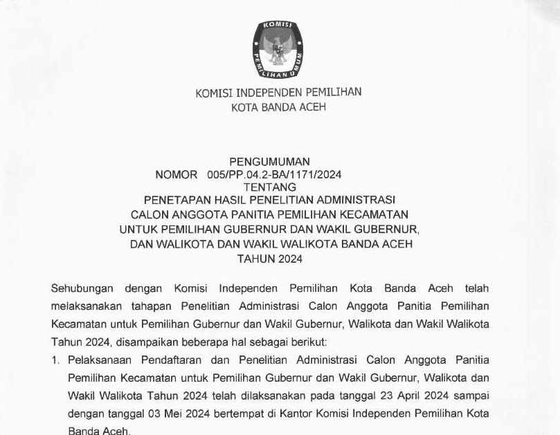 KIP Banda Aceh News – berikut pengumuman penetapan hasil penelitian administrasi calon anggota Panitia Pemilihan Kecamatan untuk Pemilihan Gubernur dan Wakil Gubernur dan Walikota dan Wakil Walikota Banda Aceh Tahun 2024.