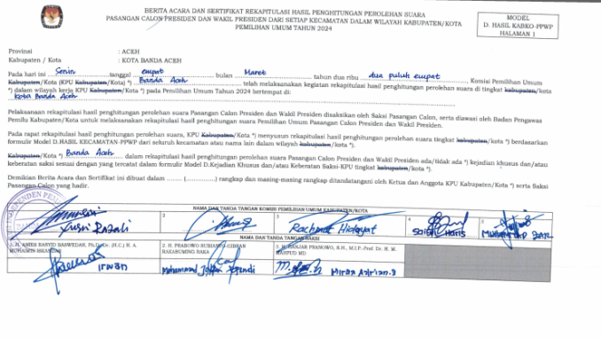 KIP Banda Aceh News – Berikut Pengumuman D. Hasil Kabkota-Dprk Rekapitulasi Hasil Penghitungan Perolehan Suara Pemilu Tahun 2024 Tingkat Kota Banda Aceh