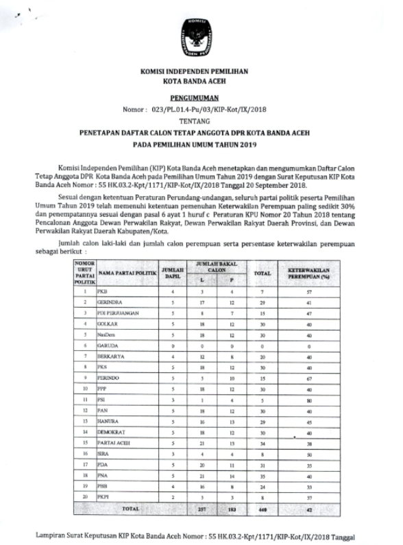 PENGUMUMAN DAFTAR CALON TETAP (DCT) ANGGOTA DPRK BANDA ACEH