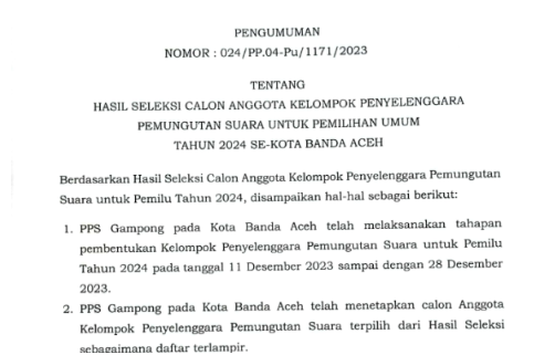 KIP Banda Aceh News – berikut pengumuman hasil seleksi calon anggota Kelompok Penyelenggara Pemungutan Suara Untuk Pemilihan Umum Tahun 2024 se- Kota Banda Aceh