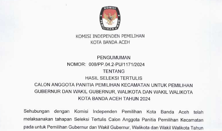 KIP Banda Aceh News – berikut pengumuman hasil seleksi tertulis calon anggota Panitia Pemilihan Kecamatan untuk Pemilihan Gubernur dan wakil Gubernur, Walikota dan Wakil Walikota Banda Aceh Tahun 2024.