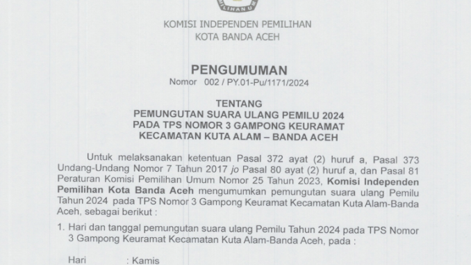 KIP Banda Aceh News – berikut pengumuman Pemungutan Suara Ulang Pemilu Tahun 2024 pada TPS Nomor 3 Gampong Keuramat Kecamatan Kuta Alam Banda Aceh PENGUMUMAN-PSU_001614