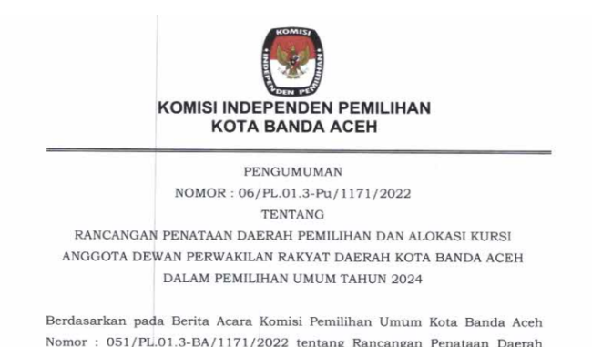 PENGUMUMAN RANCANGAN DAPIL DAN ALOKASI KURSI ANGGOTA DPRK KOTA BANDA ACEH PEMILU 2024