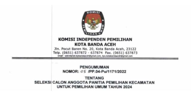 PENGUMUMAN : SELEKSI CALON PANITIA PEMILIHAN KECAMATAN (PPK) PEMILU 2024 KOTA BANDA ACEH