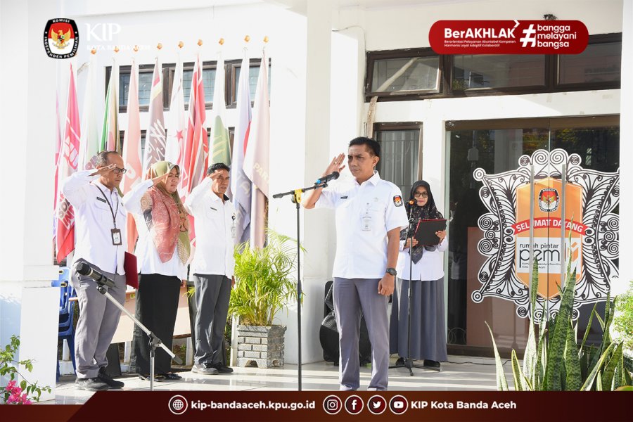 KIP Banda Aceh News – Sekretaris Komisi Independen Pemilihan (KIP) Kota Banda Aceh, Erminzal menjadi Pembina Apel Senin Pagi di Halaman Kantor KIP Kota Banda Aceh, Senin 7 Juli 2025.