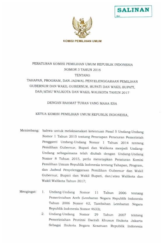 PKPU NO 03 TAHUN 2016 tentang Tahapan, Program dan Jadwal Pilkada 2017