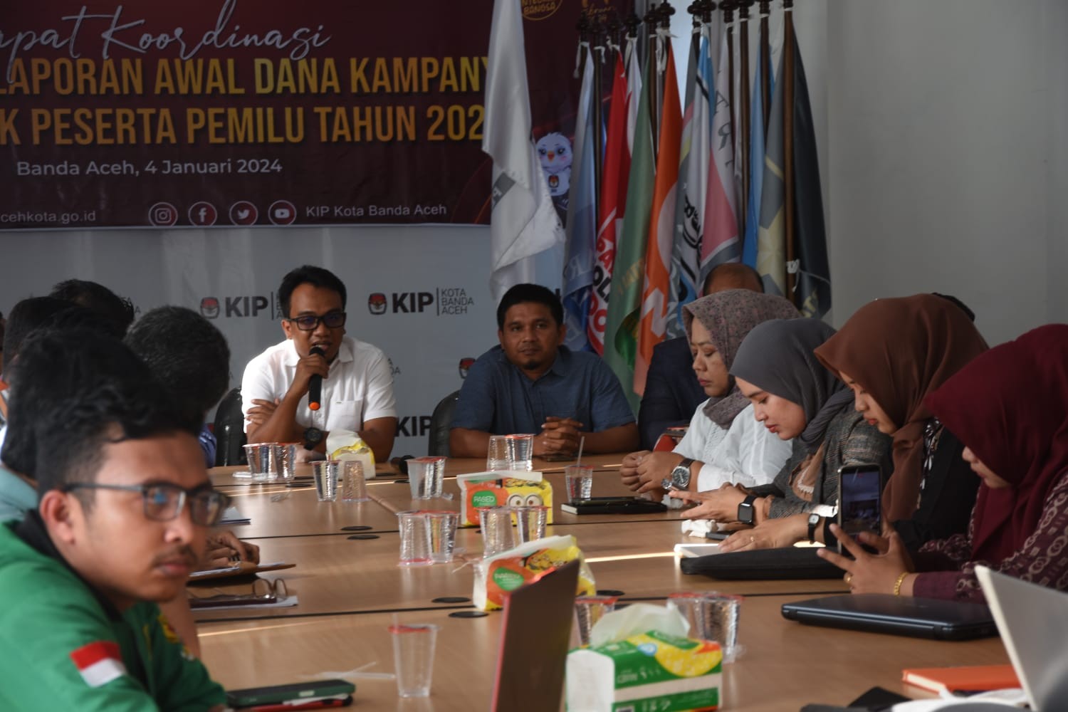 KIP Banda Aceh News - Komisi Independen Pemilihan (KIP) Kota Banda Aceh melakukan Rapat Koordinasi (Rakor) Penyampaian Laporan Awal Dana Kampanye (LADK) Pemilu 2024 di Kantor KIP Kota Banda Aceh, Kamis (4/1/2024).