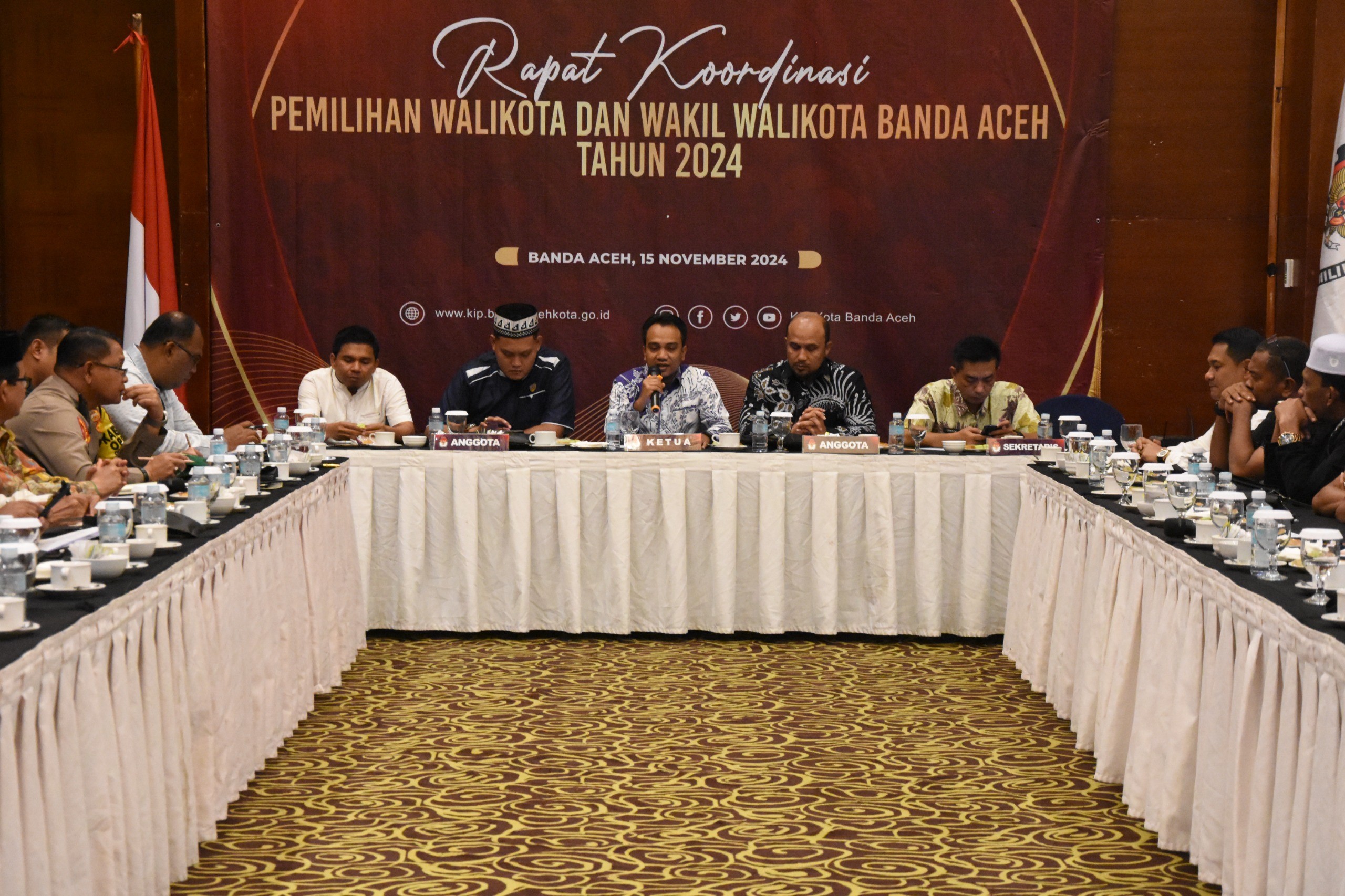 KIP Banda Aceh News – Komisi Indepden Pemilihan (KIP) Kota Banda Aceh melakukan Rapat Koordinasi (Rakor) Pemilihan Walkota dan Wakil Walkota Banda Aceh Tahun 2024 di Hotel Hermes Palace Banda Aceh, Jum'at (15 November 2024).