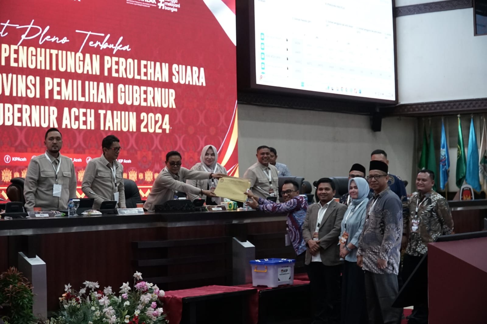 Rekapitulasi tersebut dibacakan oleh Ketua dan Anggota KIP Kota Banda Aceh untuk Tingkat Kota Banda Aceh serta Ketua dan Anggota KIP Kabupaten/Kota untuk tingkat Kabupaten/Kota pada Rekapitulasi Penghitungan Perolehan Suara Gubernur dan Wakil Gubernur Aceh Tahun 2024.