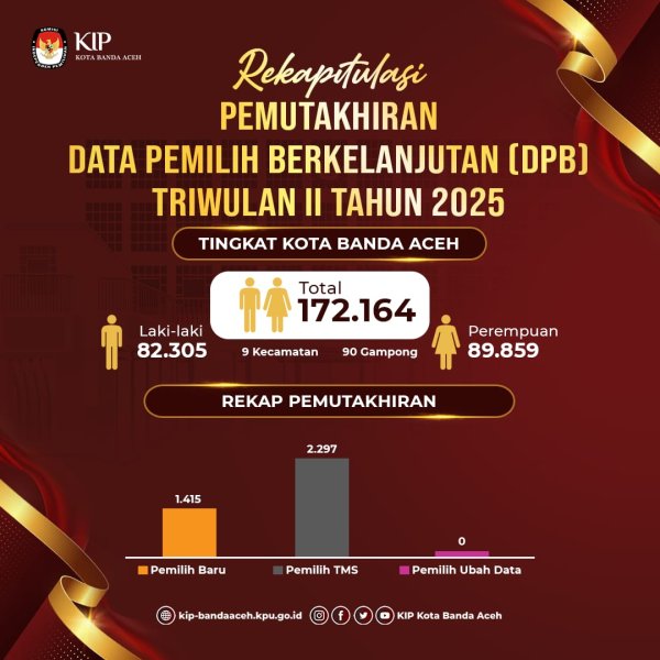KIP Banda Aceh News – Berikut Infografis Pemutakhiran Data Pemilih Berkelanjutan (PDPB) Triwulan II Tahun 2025 Tingkat Kota Banda Aceh.