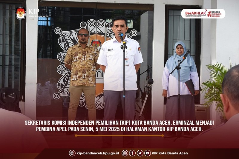 KIP Banda Aceh News – Sekretaris Komisi Independen Pemilihan (KIP) Kota Banda Aceh, Erminzal menjadi Pembina Apel pada Senin, 5 Mei 2025 di Halaman Kantor KIP Banda Aceh.