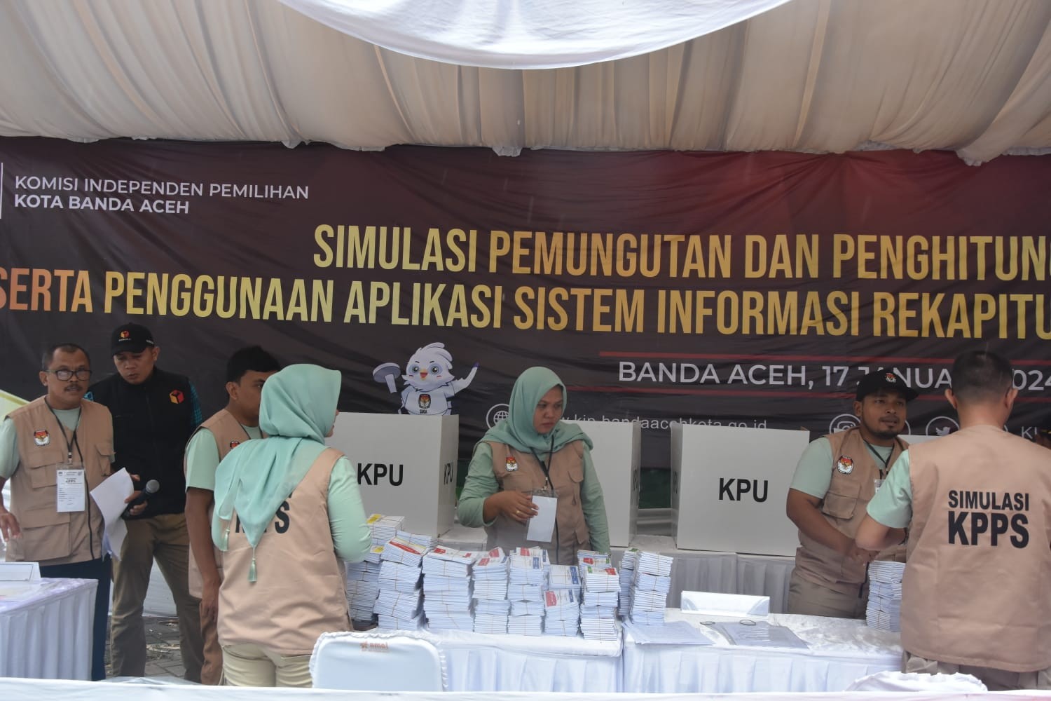 Kegiatan Simulasi setelah Pembukaan diawali dengan Sambutan Ketua KIP Kota Banda Aceh, Yusri Razali kemudian Sambutan Plh. Sekretaris Daerah Kota Banda Aceh, Wahyudi setelah itu secara langsung melakukan Simulasi bersama sejumlah Pejabat kemudian Pemilih lainnya.