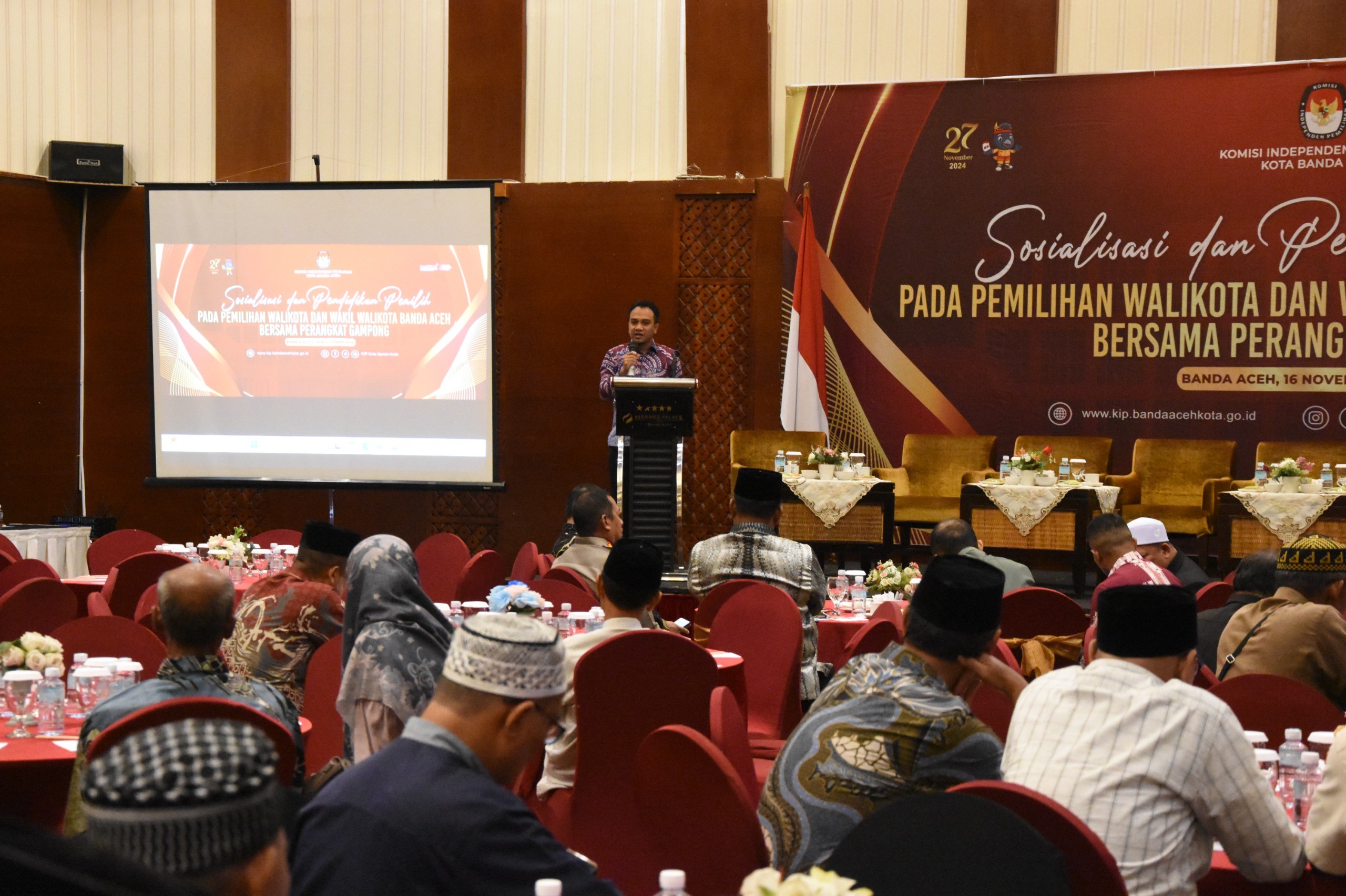 KIP Banda Aceh News – Komisi Independen Pemilihan (KIP) Kota Banda Aceh melakukan Sosialisasi dan Pendidikan Pemilih pada Pemilihan Walikota dan Wakil Walkota Tahun 2024 bersama Aparatur Gampong di Hotel Hermes Palace Banda Aceh, (Sabtu, 16 November 2024).
