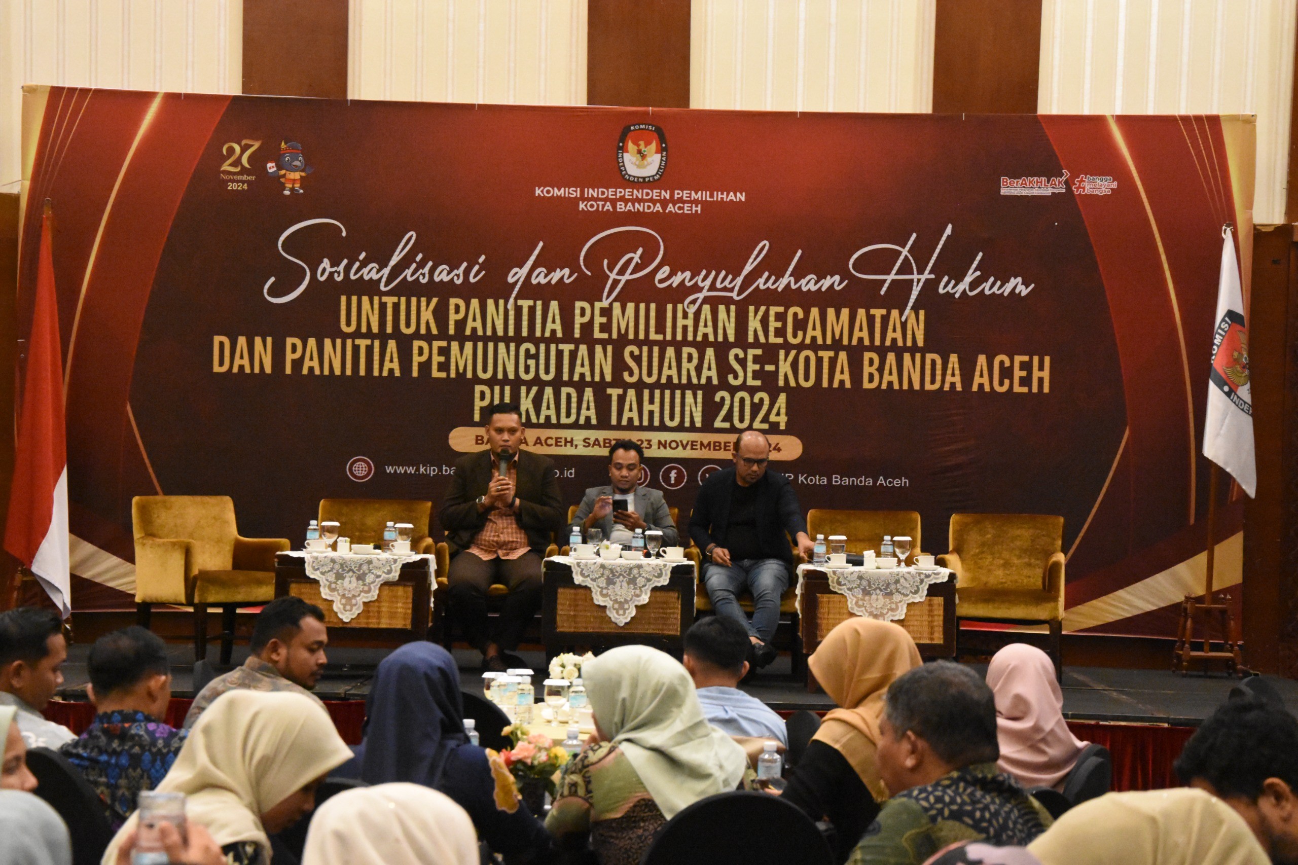 KIP Banda Aceh News – Komisi Independen Pemilihan (KIP) Kota Banda Aceh melakukan Sosialisasi dan Penyuluhan Hukum untuk Panitia Pemilihan Kecamatan dan Panitia Pemungutan Suara Se Kota Banda Aceh Pilkada Tahun 2024, Banda Aceh, 23 November 2024.