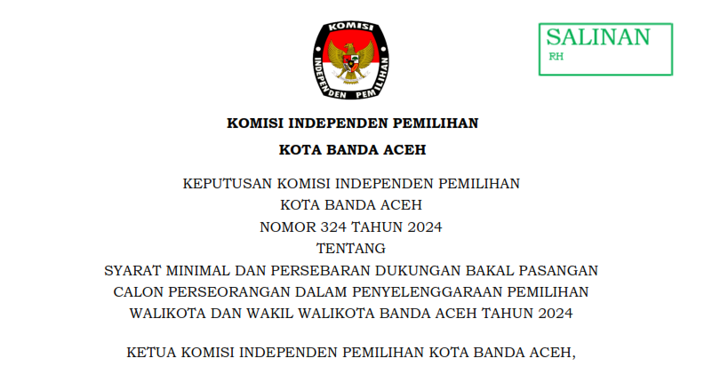 KIP Banda Aceh News – berikut Keputusan Komisi Independen Pemilihan Kota Banda Aceh Nomor 324 Tahun 2024 Tentang Syarat Minimal Dan Persebaran Dukungan Bakal Pasangan Calon Perseorangan Dalam Penyelenggaraan Pemilihan Walikota Dan Wakil Walikota Banda Aceh Tahun 2024.