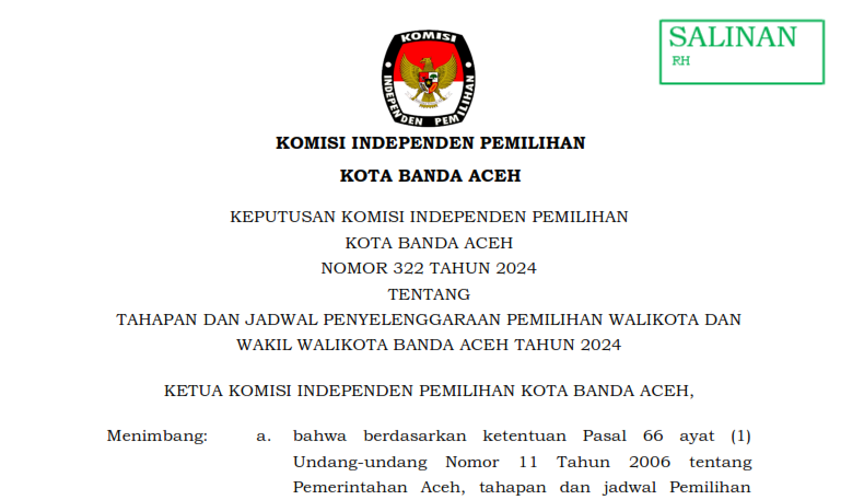 KIP Banda Aceh News – berikut Keputusan Komisi Independen PemilihanKota Banda Aceh Nomor 322 Tahun 2024 Tentang Tahapan Dan Jadwal Penyelenggaraan Pemilihan Gubernur Dan Wakil Gubernur, Bupati Dan Wakil Bupati, Dan/ Atau Walikota Dan Wakil Walikota Banda Aceh Tahun 2024.