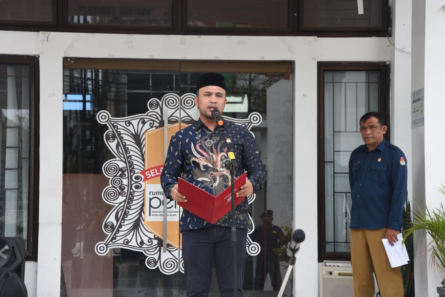 Ketua Divisi Sosialisasi, Pendidikan Pemilih, SDM dan Partisipasi Masyarakat KIP Kota Banda Aceh, Muhammad Zar bertindak sebagai Pembina Upacara yang berlangsung secara khidmat dan tertib.