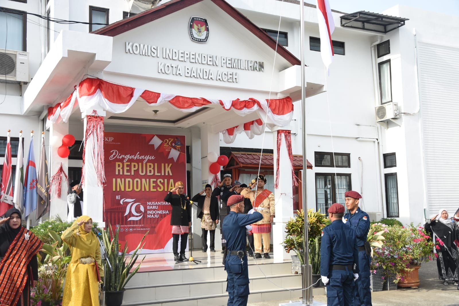 KIP Kota Banda Aceh News – Komisi Independen Pemilihan (KIP) Kota Banda Aceh melaksanakan Upacara Hari Ulang Tahun (HUT) ke- 79 Tahun di Halaman Kantor KIP Kota Banda Aceh, Sabtu (17/08/2024).