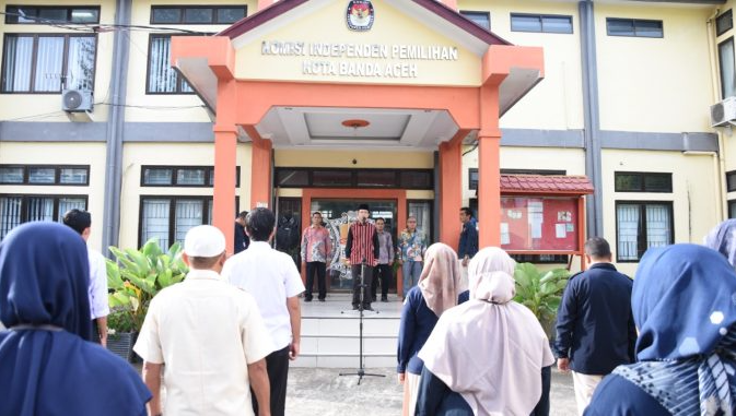Ketua KIP Kota Banda Aceh, Indra Milwady bertindak sebagai Pembina Upacara yang dihadiri oleh Anggota KIP Kota Banda Aceh, Sekretaris, Kasubbag, ASN, PPNPN dan Mahasiswa Magang.