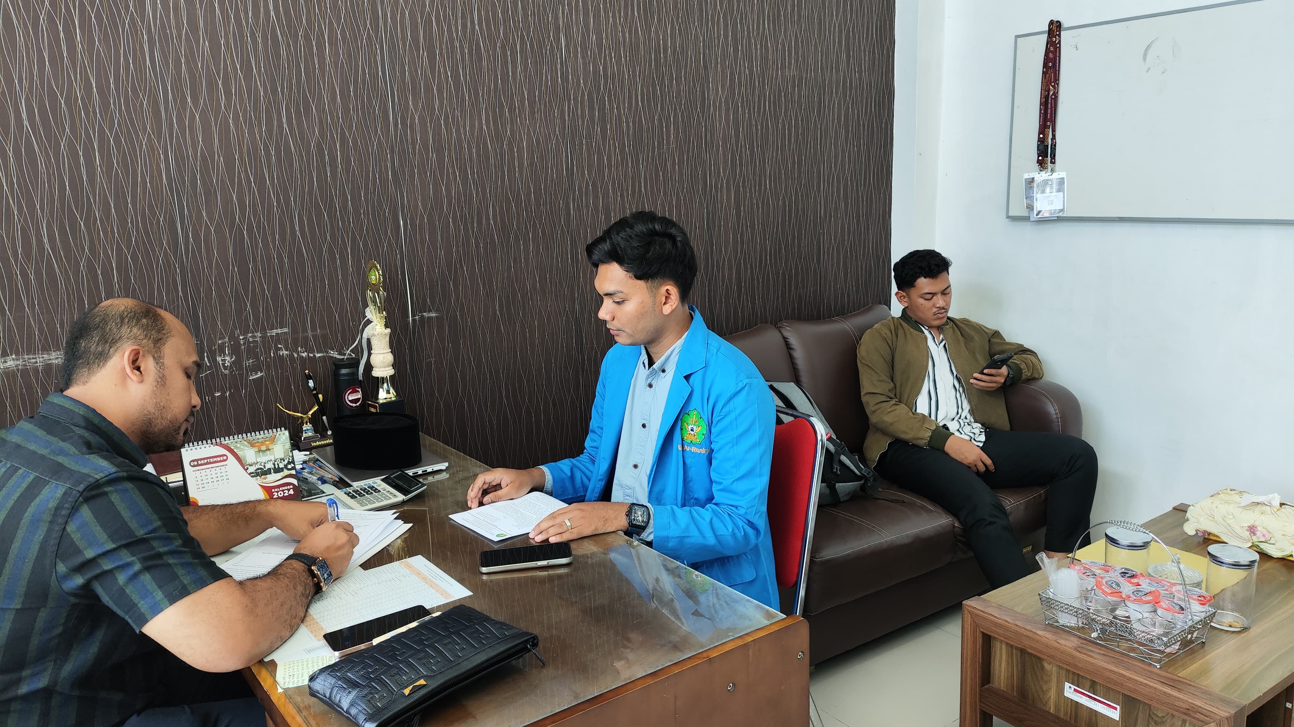 KIP Banda Aceh News – Ketua Divisi Sosialisasi Pendidikan Pemilih, SDM dan Parmas KIP Kota Banda Aceh, Muhamnad Zar sedang diwawancarai oleh mahasiawa di Kantor KIP Kota Banda Aceh, 26/9/2024.