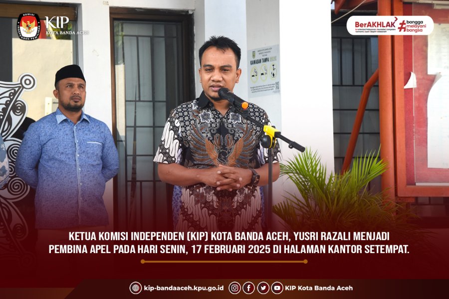 KIP Banda Aceh News - Ketua Komisi Independen (KIP) Kota Banda Aceh, Yusri Razali menjadi pembina apel pada hari Senin, 17 Februari 2025 di halaman kantor setempat.